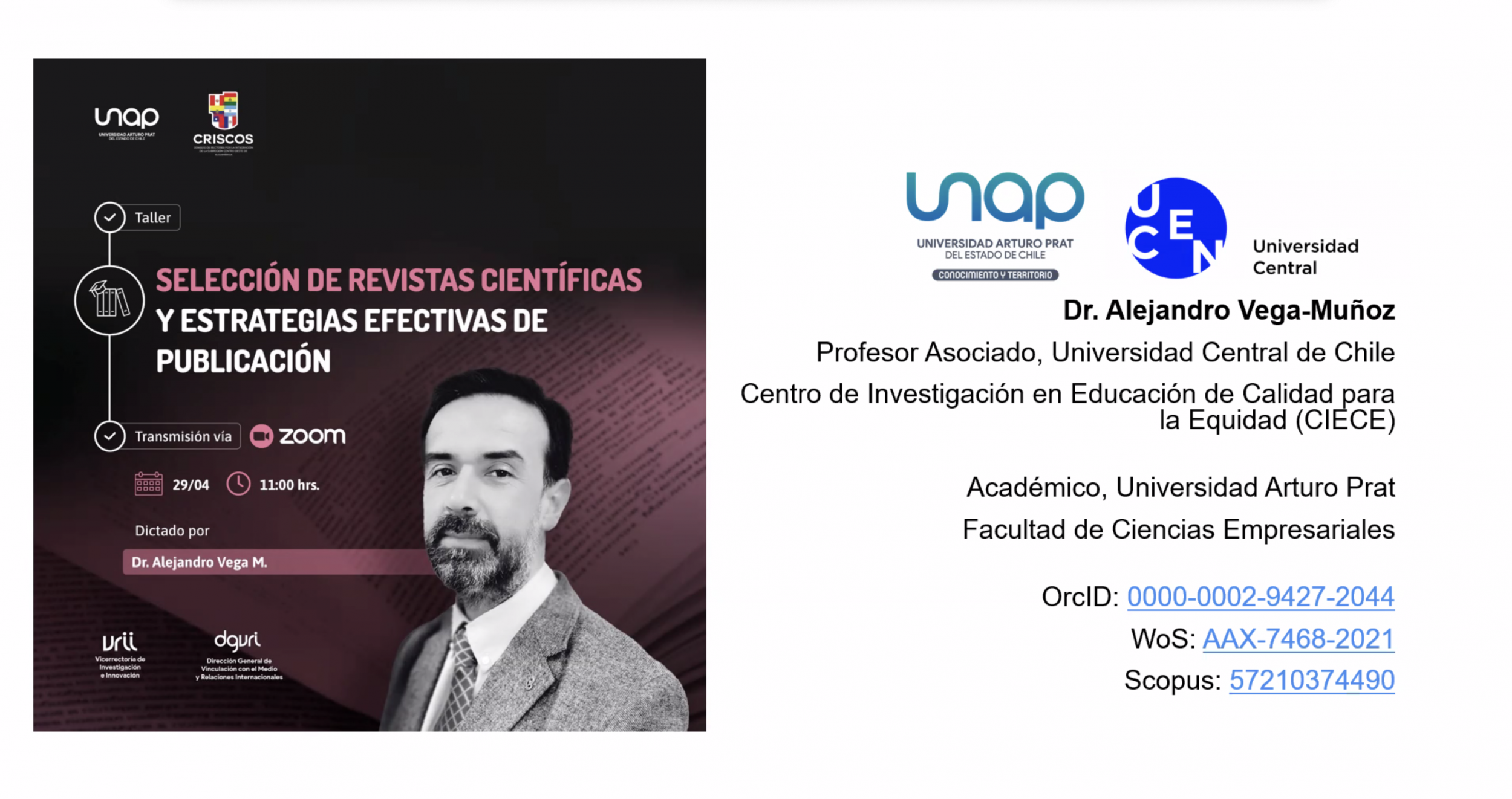 - En el marco del ciclo de talleres, se desarrolló con éxito la segunda jornada académica dedicada al fortalecimiento de competencias investigativas y al fomento de la colaboración académica regional. El taller, titulado “Selección de revistas científicas y estrategias efectivas de publicación”, fue organizado por la Universidad Arturo Prat (UNAP) y reunió a académicos e investigadores de universidades de Chile y Argentina.